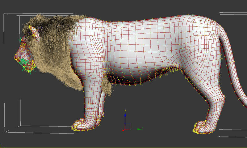 Scene: For faster rendering and stability. It is a basic scene divide into two scenes (Fur render and Vray render) BASE SCENE is: Lion_fur.max Materials in both stages are attached and the lights are the same.
