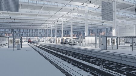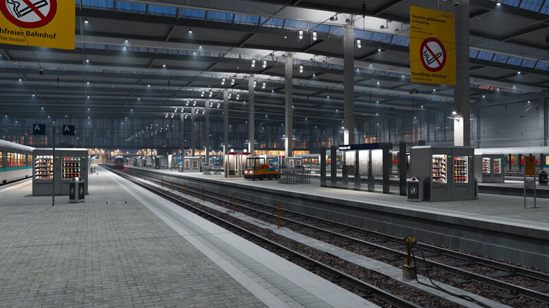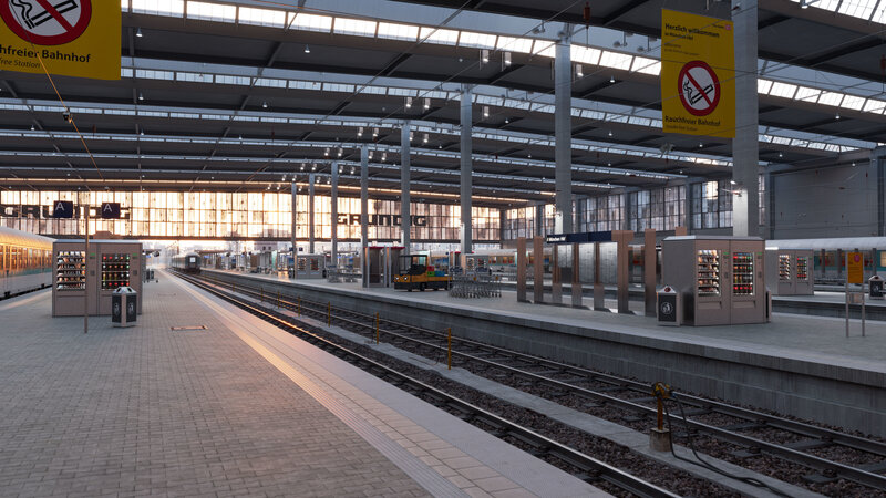 Scene with platform, rails, catenary, bench, speaker, trash bin, manhole cover, station roof and tower, display and section markers, snack vending machines, baggage trolley and baggage car, phone box, waiting areas, and much more, shaded and lit in two states (day and night) for V-Ray 5 and in 3D Studio Max 2016/2019, rendersettings and V-Ray color corrections are included, as well as all textures.