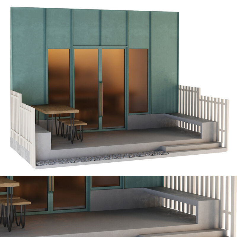 Entrance doors lined with aluminum panels with a matte green finish. The cladding has thick seams that give the façade a vertical rhythm. Cast concrete benches on both sides extend from the front to the edge of the patio.