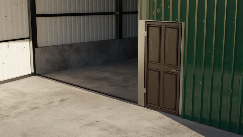 Metal profile shed or workshop for farms, scenery or other. One big metal door and one small wooden door to be opened or closed.