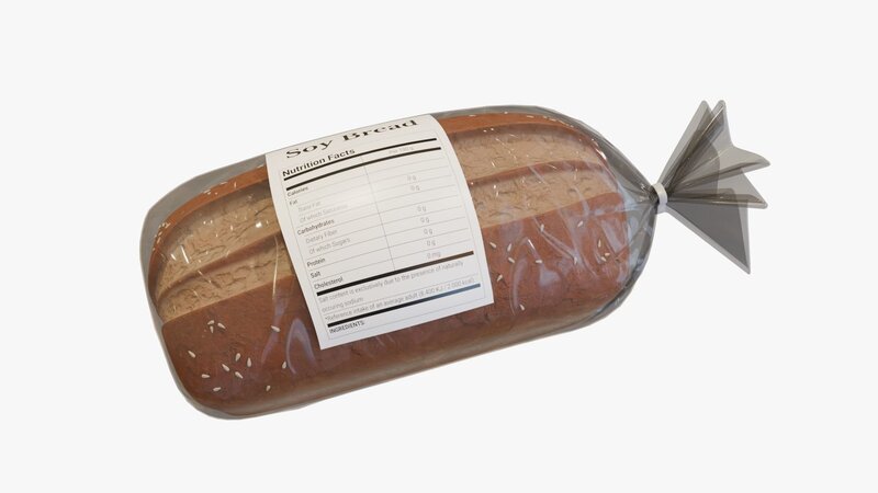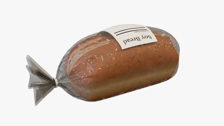 Soy-based bread: A loaf of soft and fluffy soy-based bread, packaged in a plastic bag. The bag is transparent, allowing you to see the light brown bread inside.