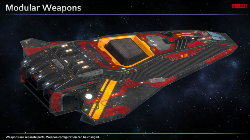 Scifi bomber Modular design 5 barrels, missile launcher + missile, 2 weapon pods 6 different texture sets PSD with intact layers is included PBR textures Texture sizes are 4096 (ship) and 1024 (weapons) Tris count ca. 1300 Final tris count depends on how many weapons are used for the ship